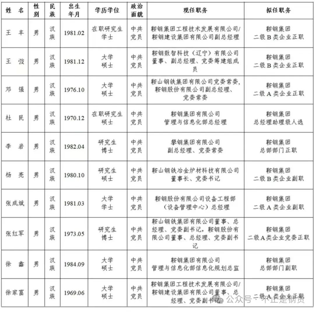 (1)现任攀钢集团总经理谢俊勇是1965年9月出生,此前也担任过鞍钢股份董事、副总经理职务。拟任鞍钢集团二级A类企业正职的邓强也有类似经历;